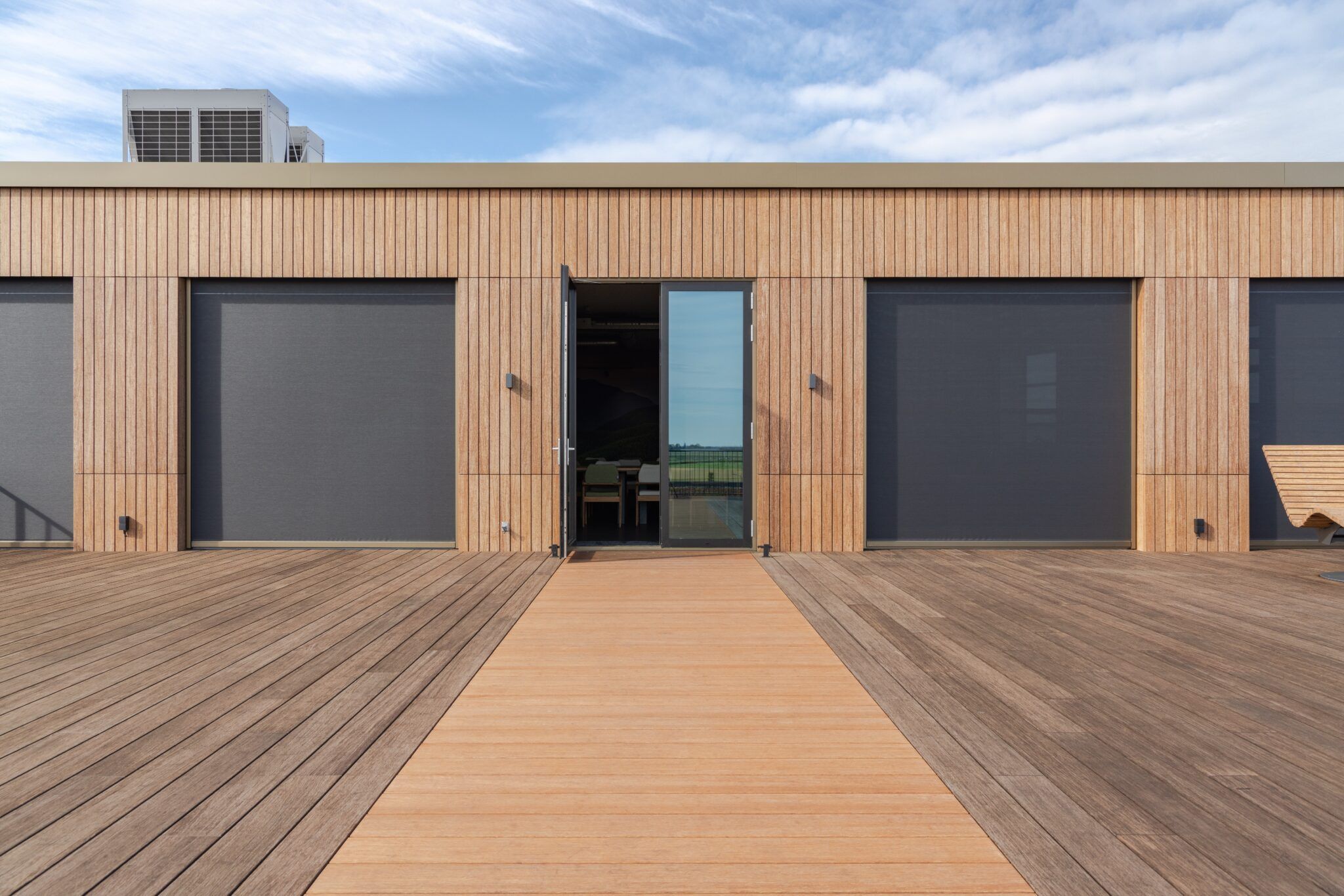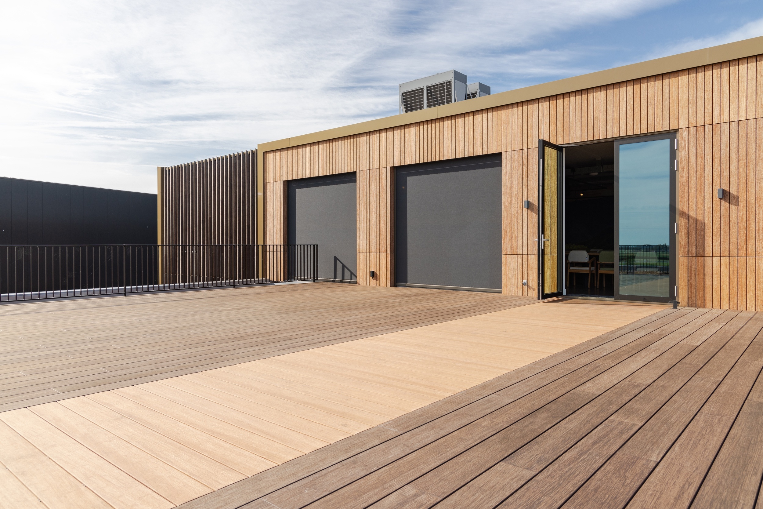 De N-durance op de gevel bij het dakterras is een innovatief en duurzaam bamboemateriaal dat perfect aansluit bij ecologische bouwprojecten. Het biedt een natuurlijke en lichtere kleur dan de X-treme en is ook eenvoudig te monteren dankzij het Clickwood on Grad systeem.