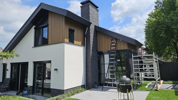 Dankzij de kleurvaste eigenschappen van NewTechWood blijft de gevel langdurig mooi, met minimale onderhoudsbehoefte. Een stijlvol resultaat door hoogwaardige materiaalkeuze.