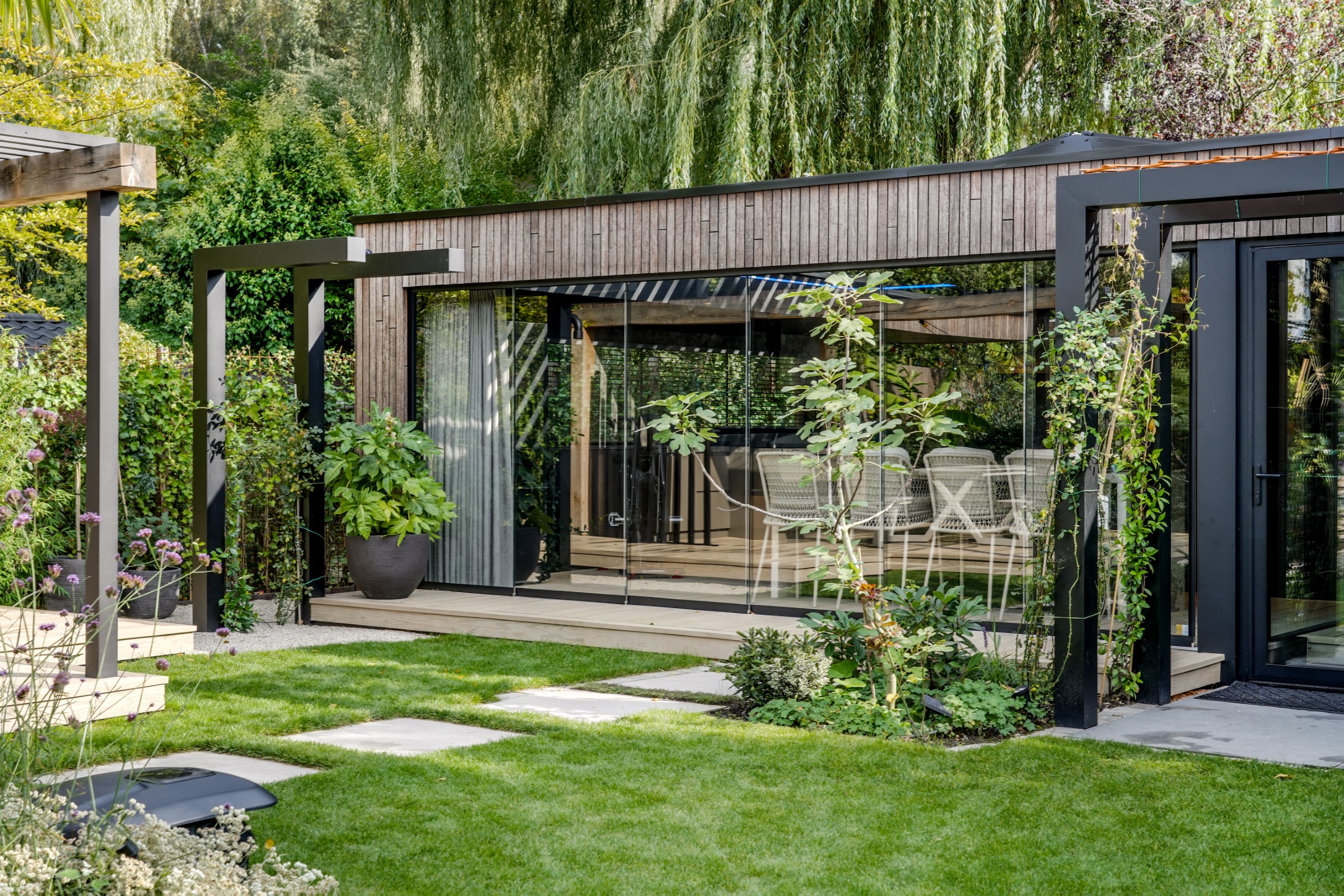 - Op de gevel van het tuinhuis, als stijlvolle bekleding