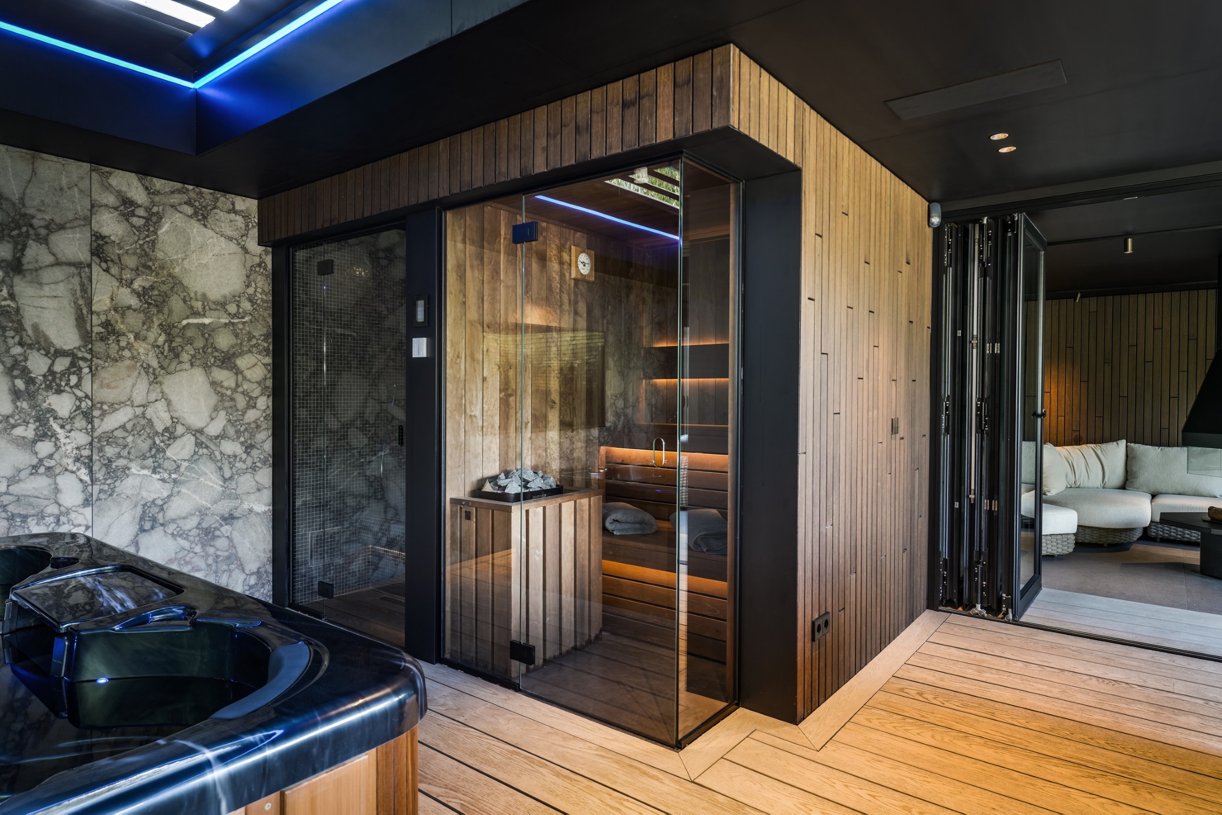 - Zelfs op de sauna, waar het materiaal zijn robuustheid en esthetiek bewijst